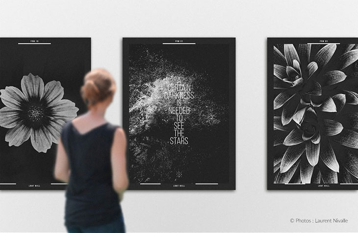 | Type de fabrication : tirages expo en rendez-vous, impressions jet d’encre pigmentaire sur papier fine art, contrecollés sur aluminium, montés en caisses américaines bois wengé. Impressions jet d’encre latex sur vinyle, pelliculage satiné. |