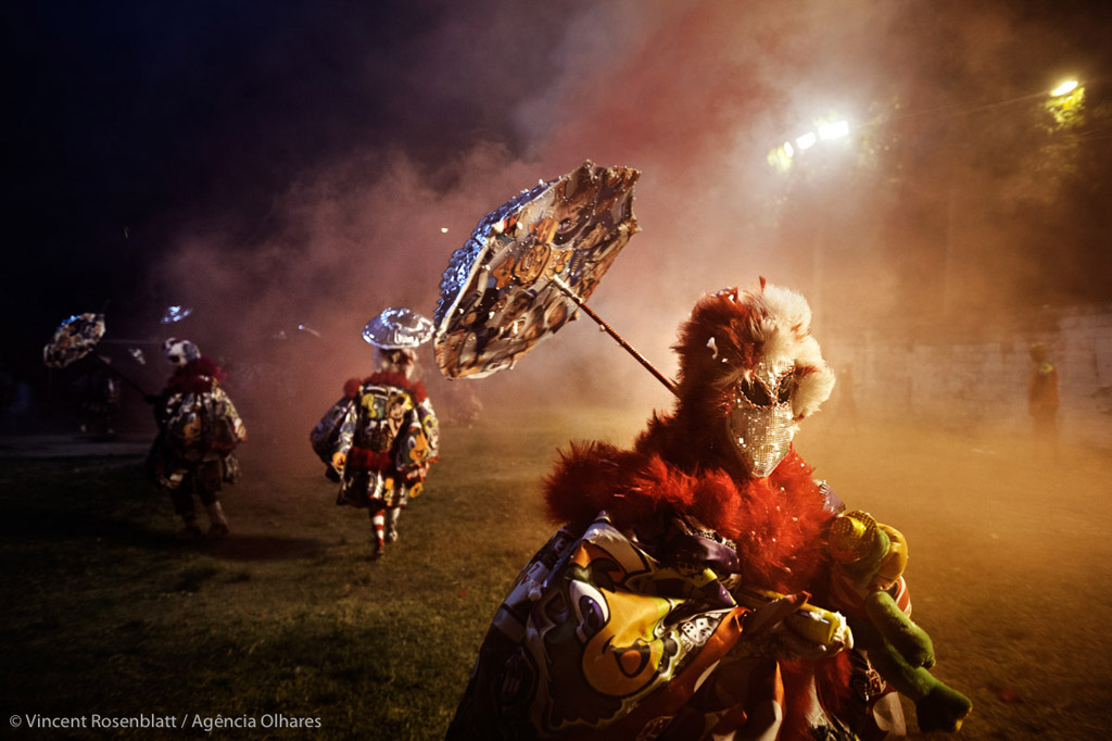 Pendant que les cameras du monde entier sont braquées sur les défilés des écoles de samba, d’effrayantes et délicieuses créatures submergent les rues désertes de la lointaine périphérie de Rio. Déferlant sur la ville en gang, des hordes de clowns, improbables croisements entre l’Arlequin, héros sortis des mangas japonais, et de guerrier africain, terrorisent et font les délices des habitants des favelas et périphéries de la ville. C’est avec ce travail photographique, que Vincent Rosenblatt présente sa nouvelle exposition à la Galerie de l’Alliance Française.