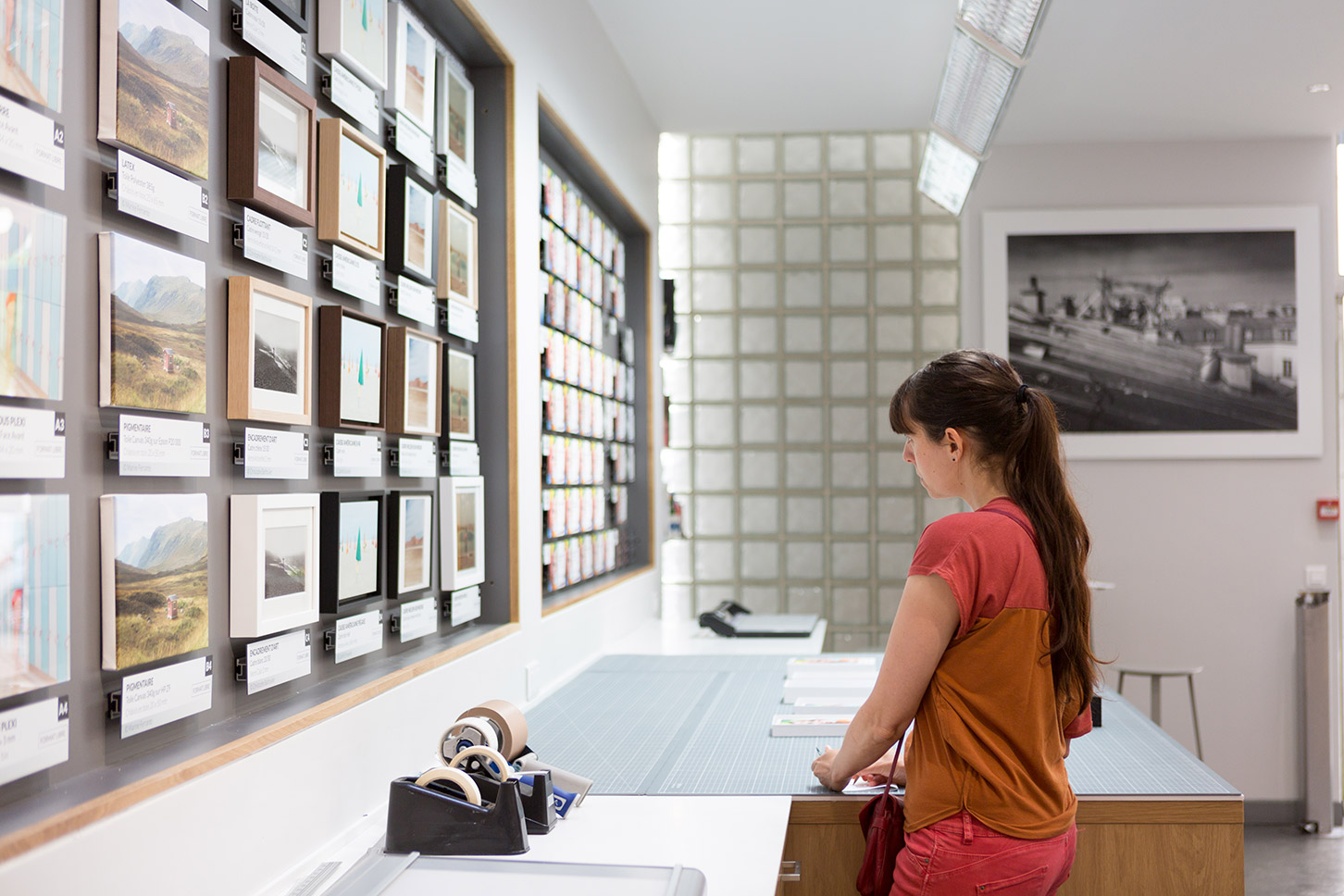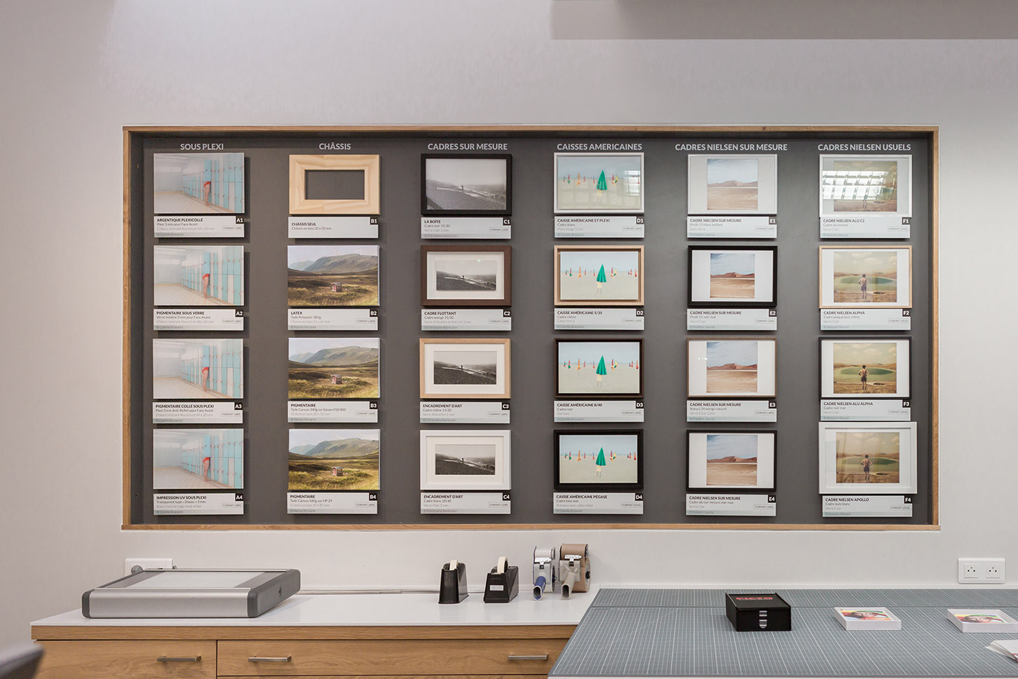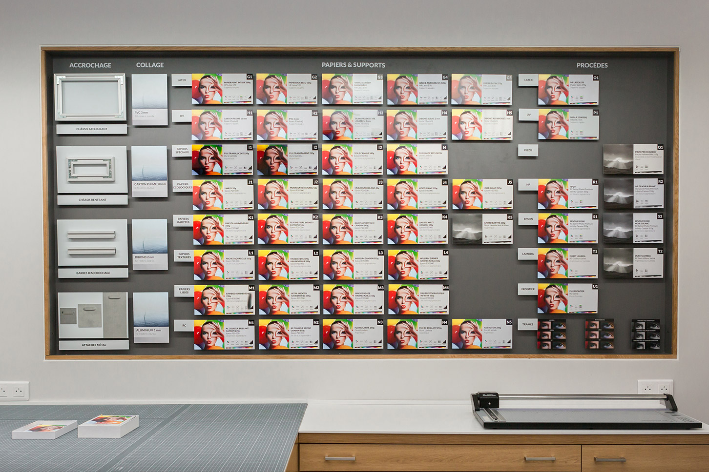 Aujourd’hui, ce nouveau showroom spacieux et lumineux réunit l’accueil, un espace de consultation de commande et un open space avec les conseillers du laboratoire à l’écoute des photographes. Vous retrouverez dès l’entrée, l’ensemble des prestations proposées par typologies allant du tirage jusqu’aux finitions vous permettant de consulter un large choix d’échantillons.