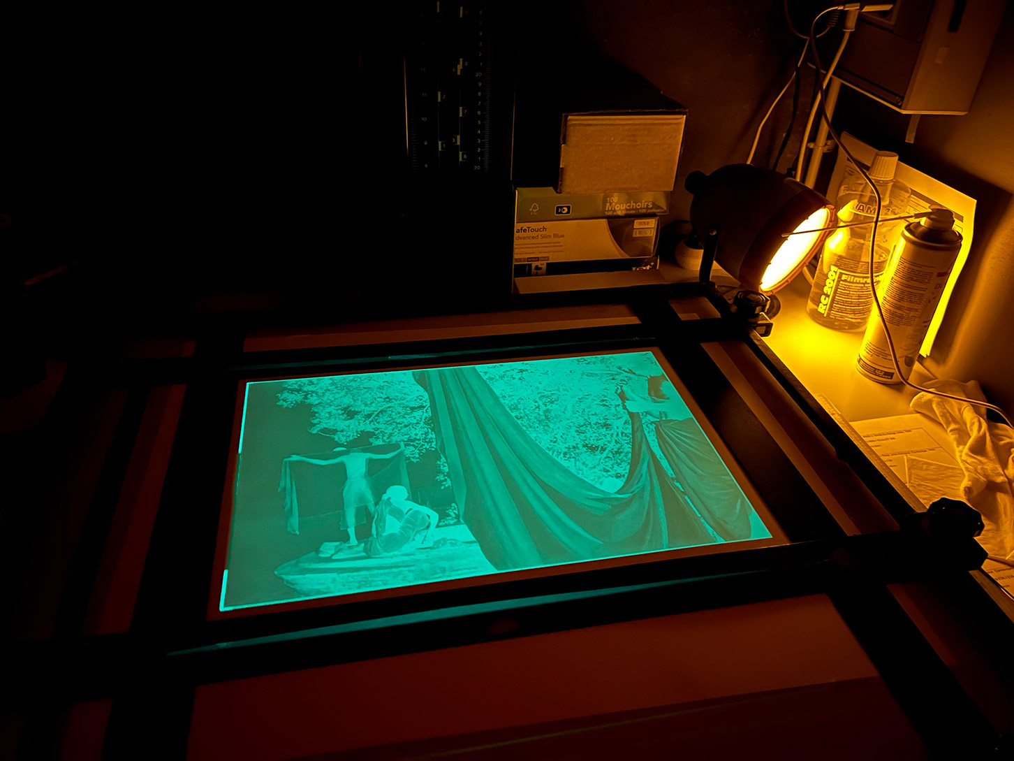 Type de fabrication : Tirages argentiques noir et blanc, tirages duratrans, collages et caissons lumineux..
