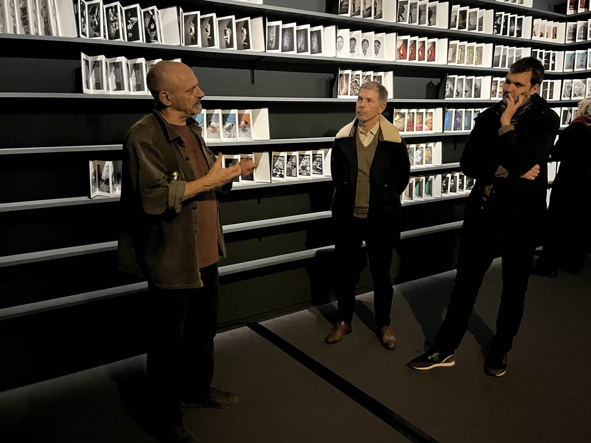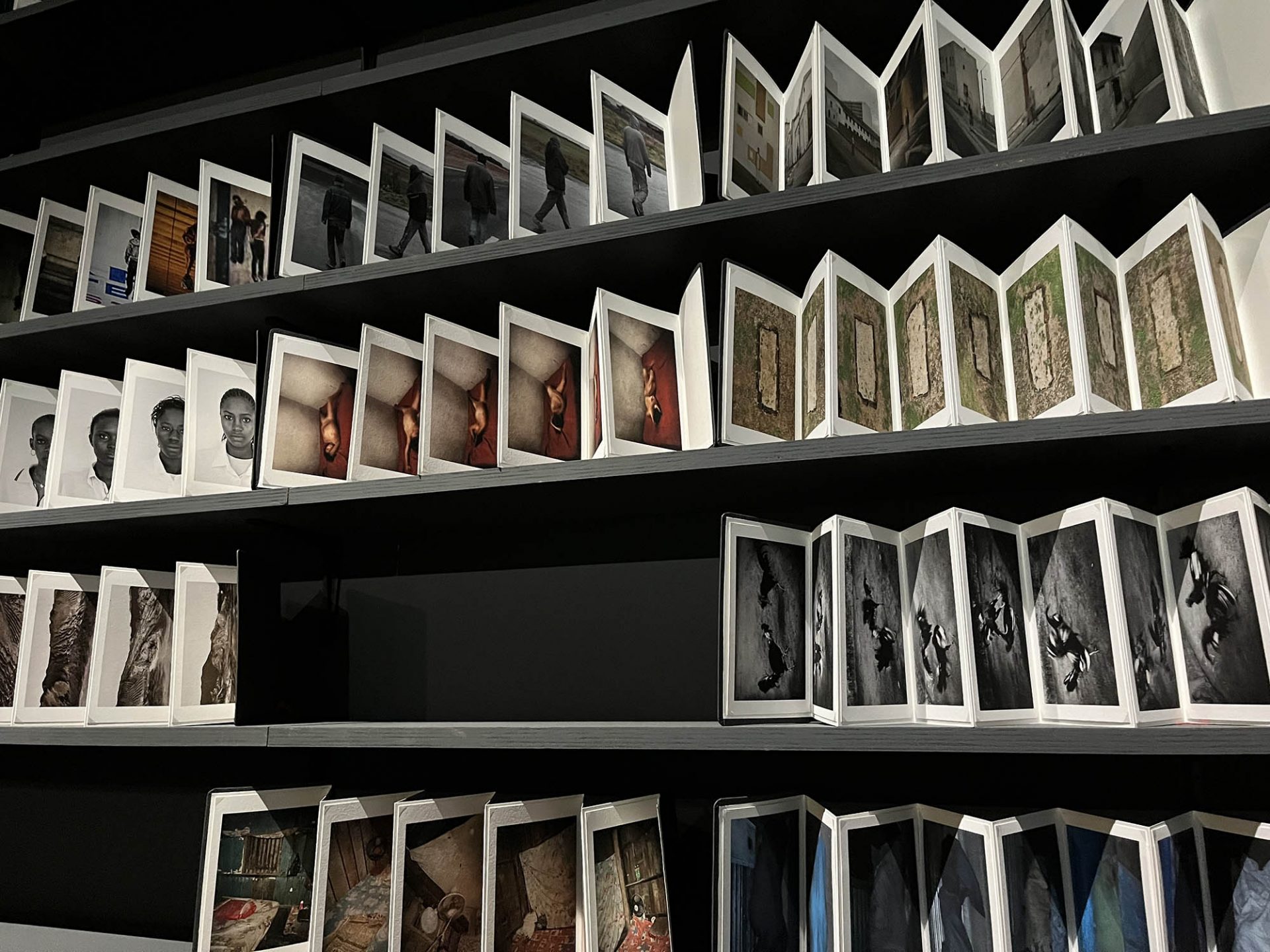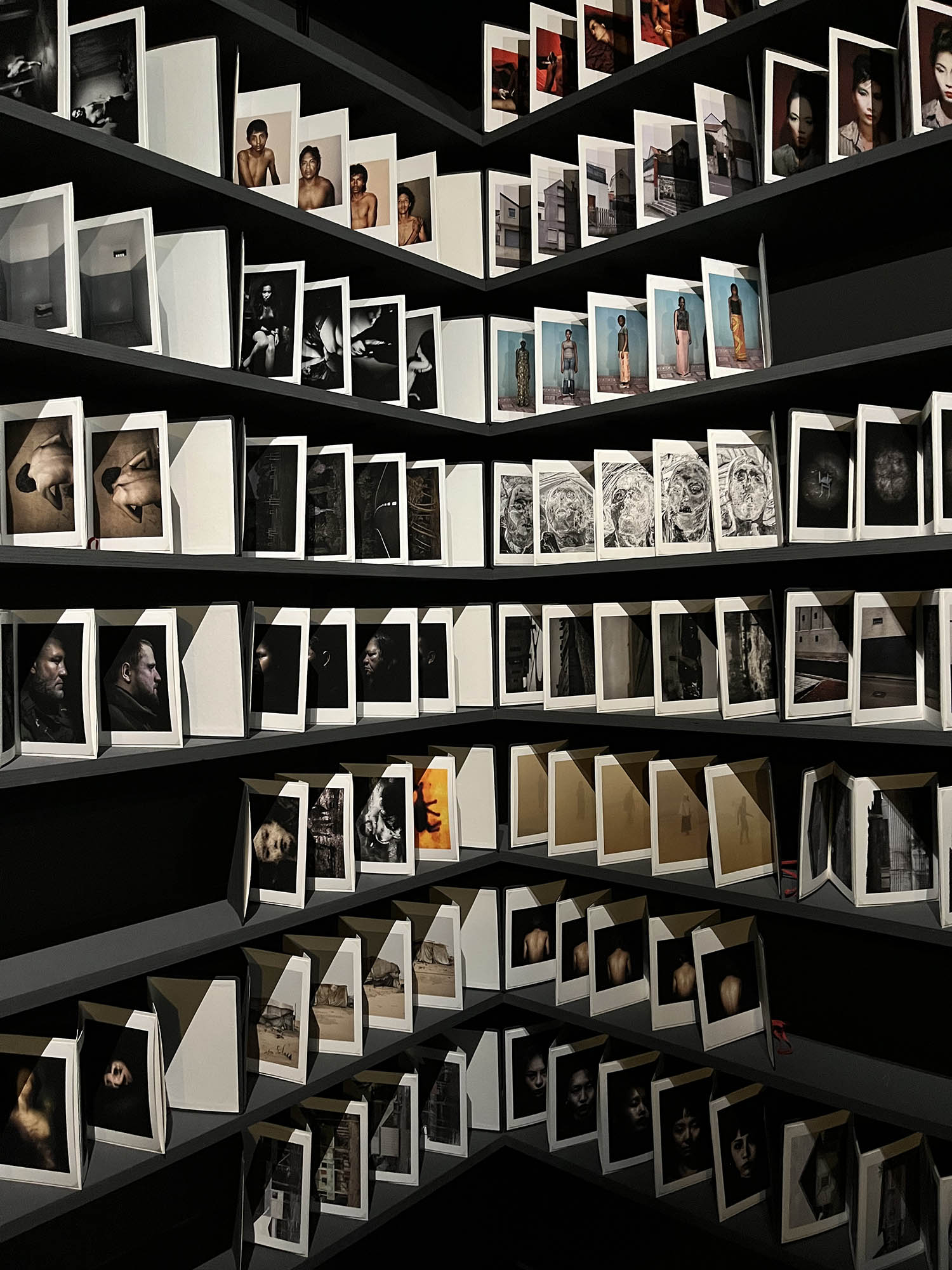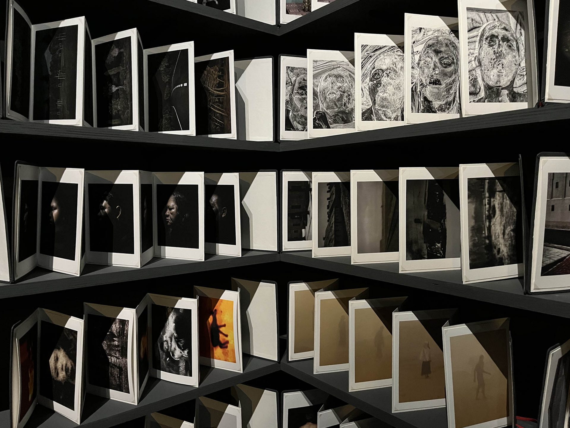 256 carnets pour 256 séquences d’images qui sont autant de tentatives de vivre à la hauteur de ses convictions ! L’œuvre d’Antoine d’Agata est comme un chaos qui bouillonne en lui. Il s’agit d’offrir à ce foisonnement une dimension formelle et symbolique où prendra forme la vision de l’artiste, résolument pensée pour être vécue. Chaque carnet contient 9 photographies – sélection resserrée de séries qui en comportent parfois plusieurs centaines – ainsi que les reproductions d’objets et de documents et textes de référence qui accompagneront le travail photographique dans un ouvrage dont la publication est prévue en octobre 2025. Lors de la visite commentée par l’artiste de l’atelier « Méthode » que nous avons eu la possibilité de faire mi-décembre, près de la moitié des carnets était finalisée. A l’issue du processus de l’exposition « Méthode », le monolithe d’archives trouvera sa place dans un lieu en cours de construction.
