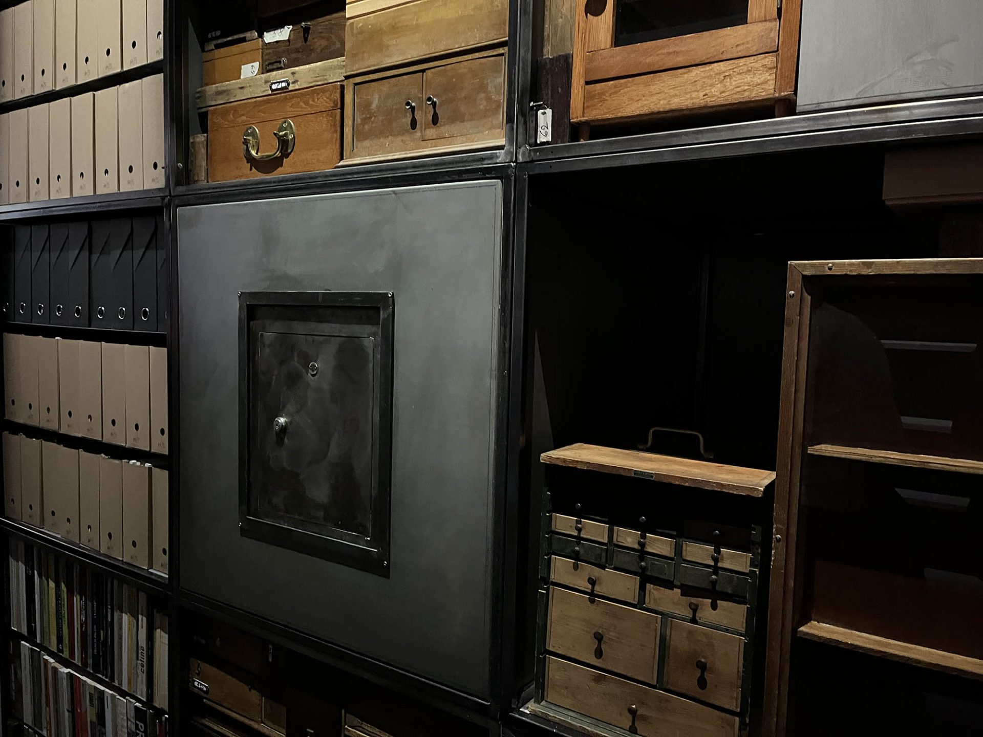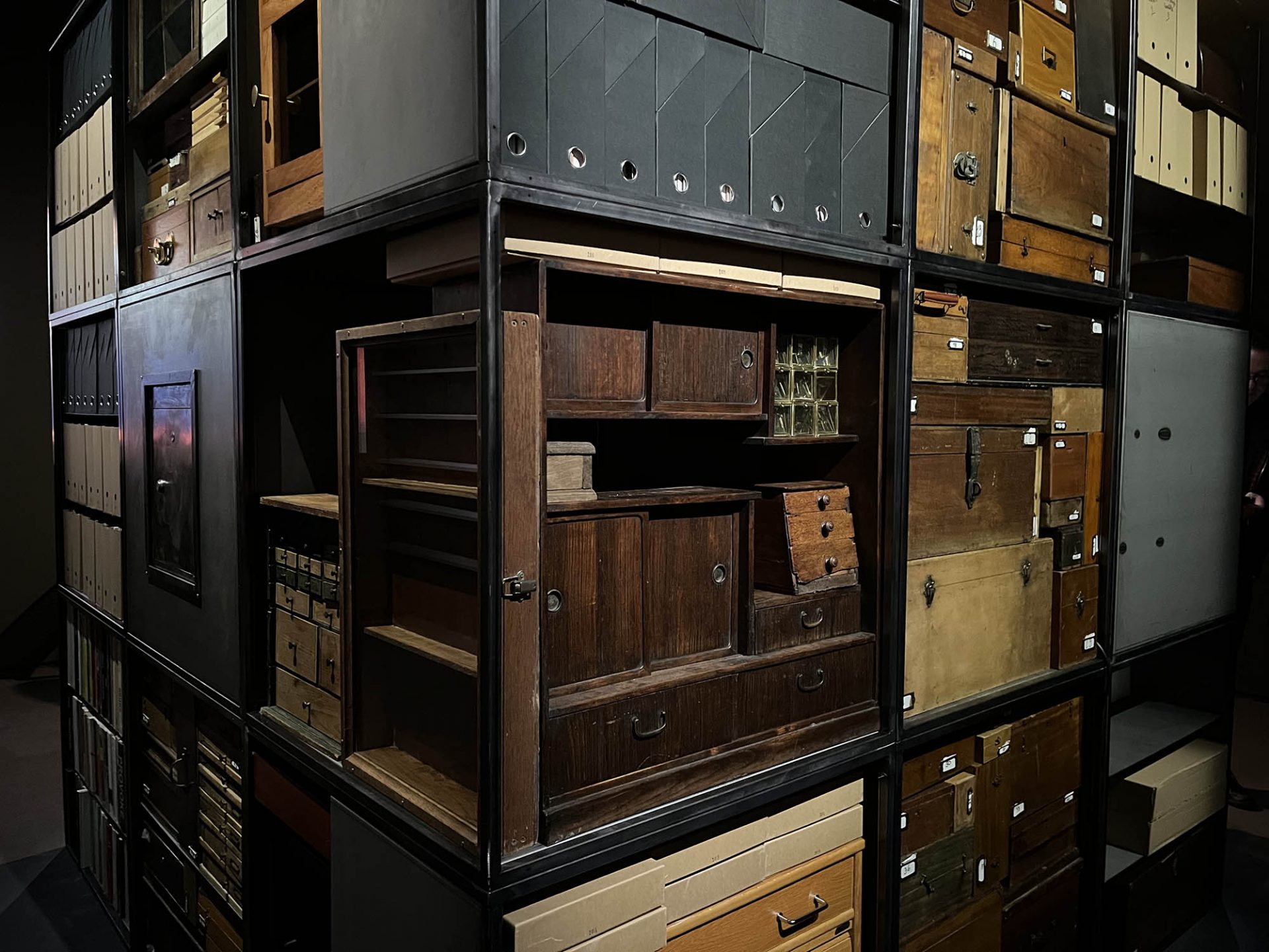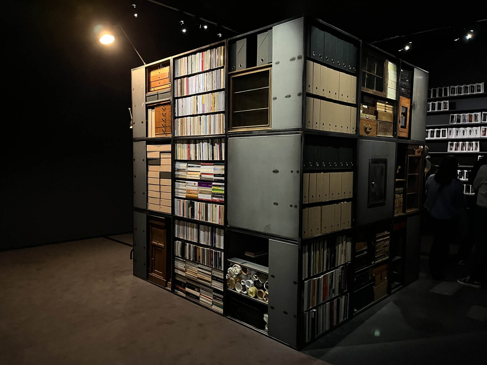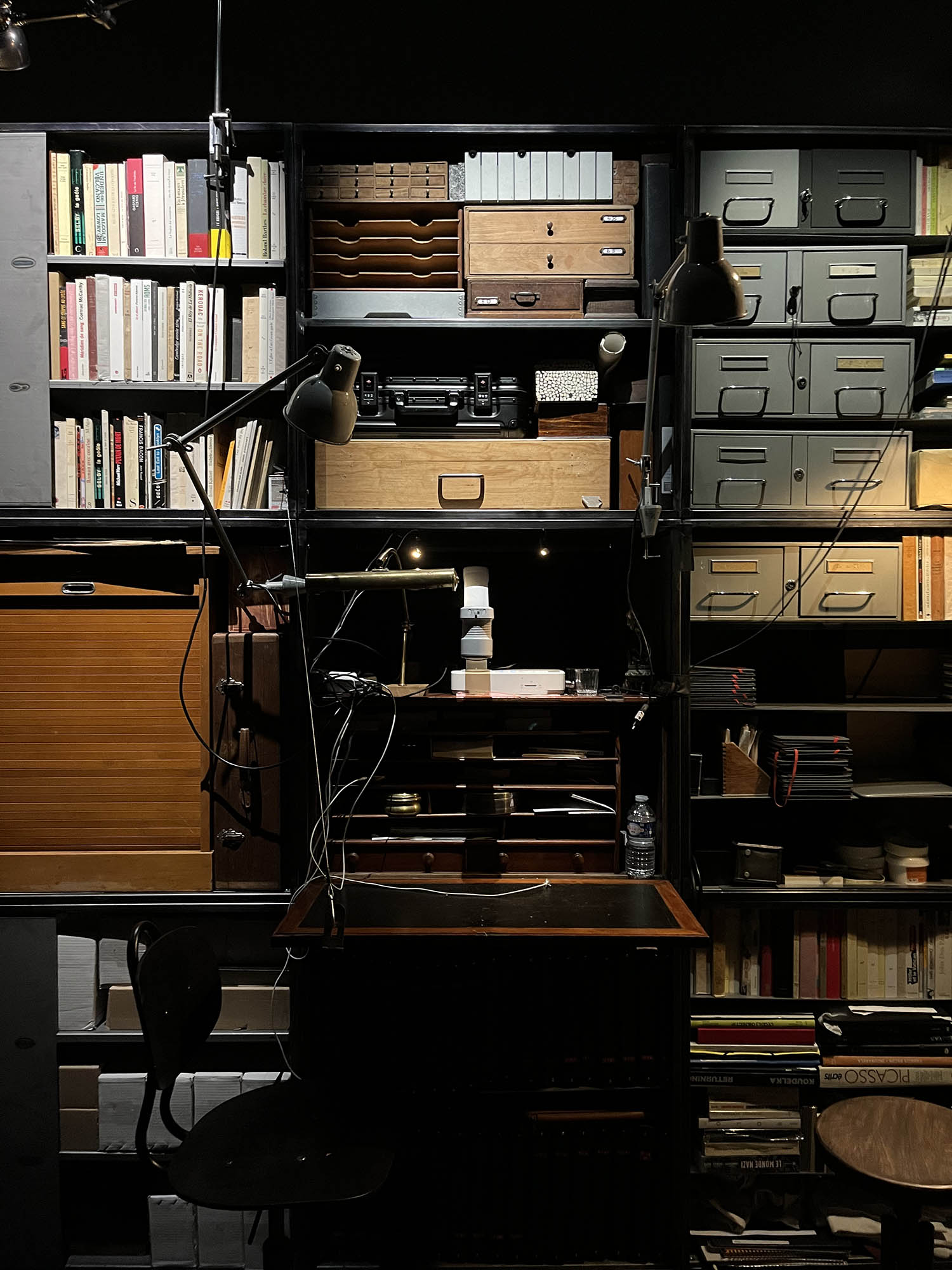 Processus à dimension avant tout existentielle par lequel Antoine d’Agata ambitionne de retrouver une liberté totale en se libérant du travail généré trente années durant, afin de réinventer enjeux et stratégies de vie . La « pièce/atelier » rassemble dans une structure cubique de près de 3 mètres d’arêtes toute l’archive artistique du photographe ainsi que ses possessions matérielles. Y sont classés dans des dossiers les catalogues, publications, livres et notes personnelles relatives à son travail. S’y retrouve une dense bibliothèque de livres (essais, romans, textes théoriques,) ayant nourri son parcours et ses pérégrinations antérieures aux années de photographie. Des boites et des valises, enfin, contiennent collections d’objets et documents relatifs à sa perspective sur le monde, ainsi que le précieux matériel photographique qui en découle (planches-contacts et disques durs), là où l’auront conduit ses recherches et ses rencontres. Antoine d’Agata fige en l’état le processus de création pour retrouver une autonomie, pour ne conserver au final qu’un sac de vêtements et un boitier photographique.