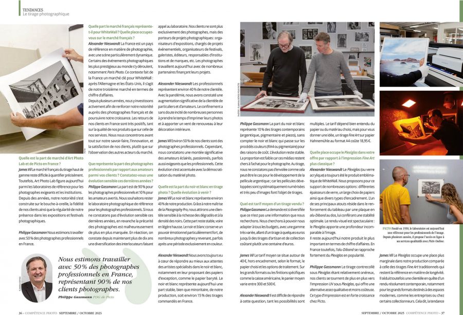“Afin de mieux cerner les nouveaux enjeux du tirage photographique, les dirigeants de trois grands laboratoires photo (Picto, WhiteWall et Art Photo Lab) ont accepté de répondre à nos questions.”