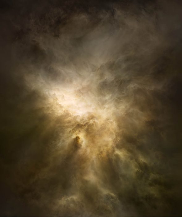 Dans l’oeuvre Analogue 26922.21225, première création de la série en cours Les Analogues, le déferlement des cascades se métamorphose en un royaume de lumière souveraine, organisant le monde comme un incessant mirage. A la lisière où l’éruption se fait déluge, l’incandescence se couvre de cendres chaudes et de ruissellements obscurs. Elle devient une force organisant la matière en des « hypothèses de paysages » vaporeux ou telluriques, naissants ou finissants : certainement tout à la fois, pour ne rien lever du mystère dont ils proviennent. Dans La Source, issue de la série Les Paradisiaques, la nature ainsi formée irradie sa lumière d’éclipse, des cimes blanches à la terre noire et matricielle. Un dessin commun entre la photographie et la gravure se donne à voir, indiciel et liminaire, puisant dans la technique de l’héliogravure la force de son trouble.
