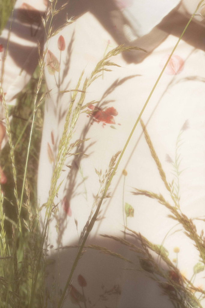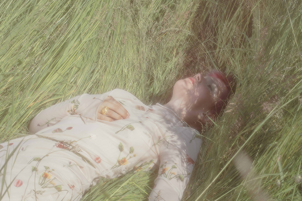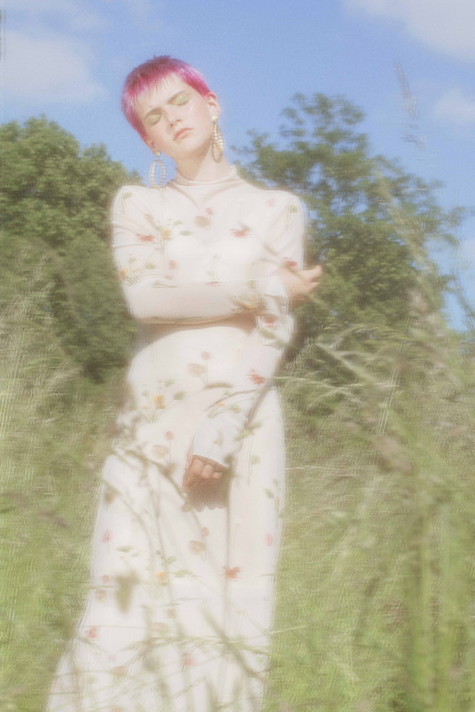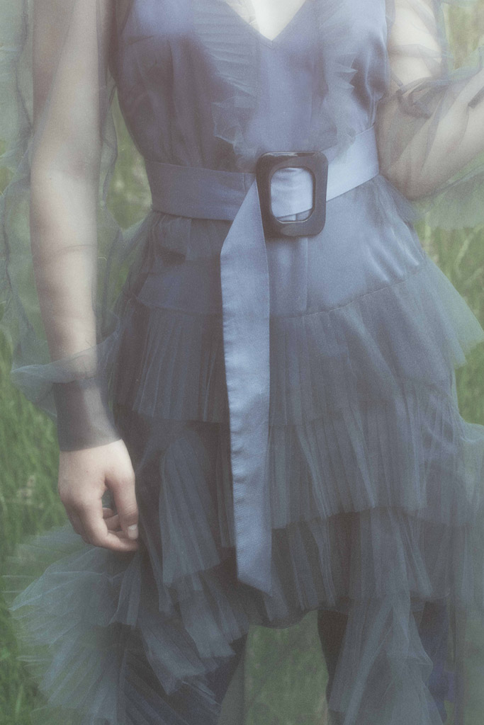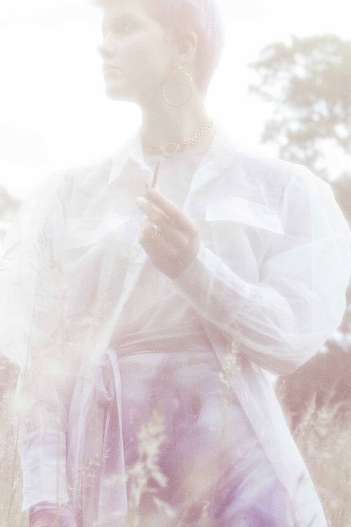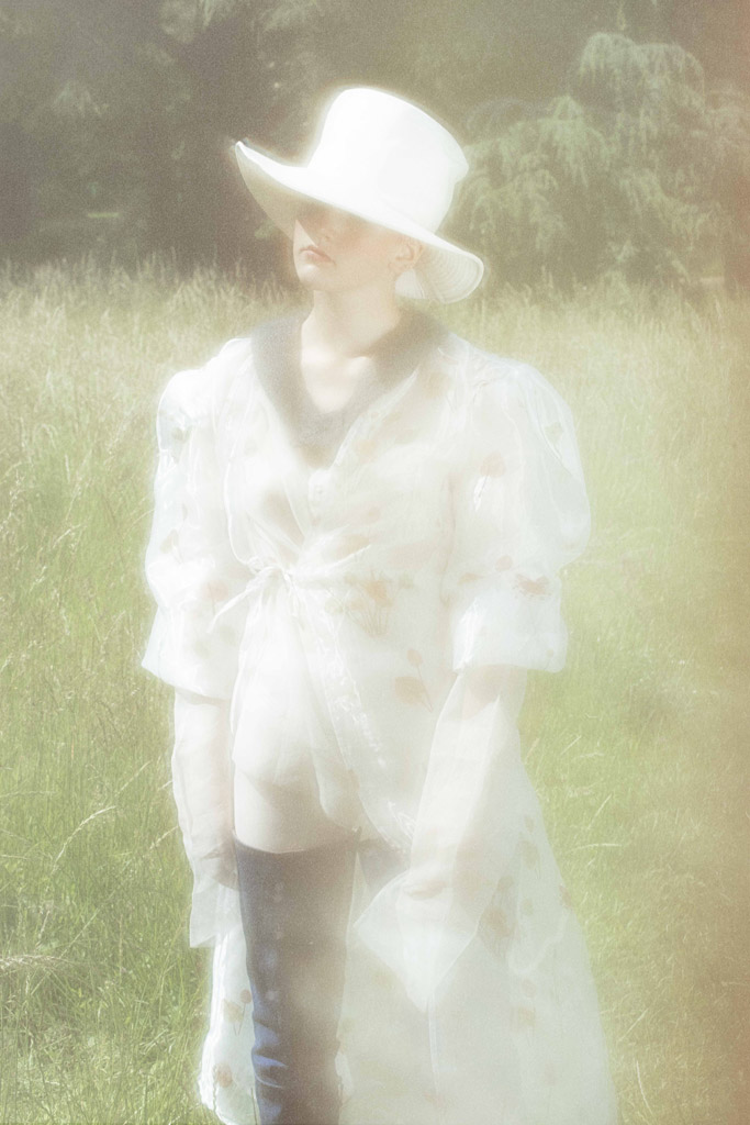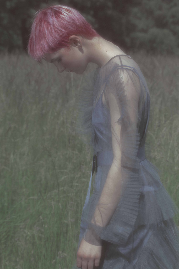 J’ai eu envie de montrer un personnage singulier évoluant dans la nature dans des robes aériennes. A travers mes photographies, j’ai représenté mon modèle comme une poupée de porcelaine, inanimée.