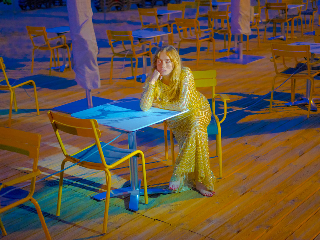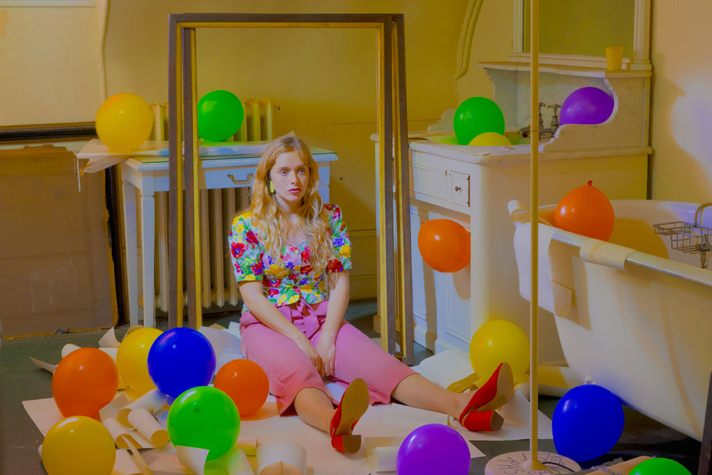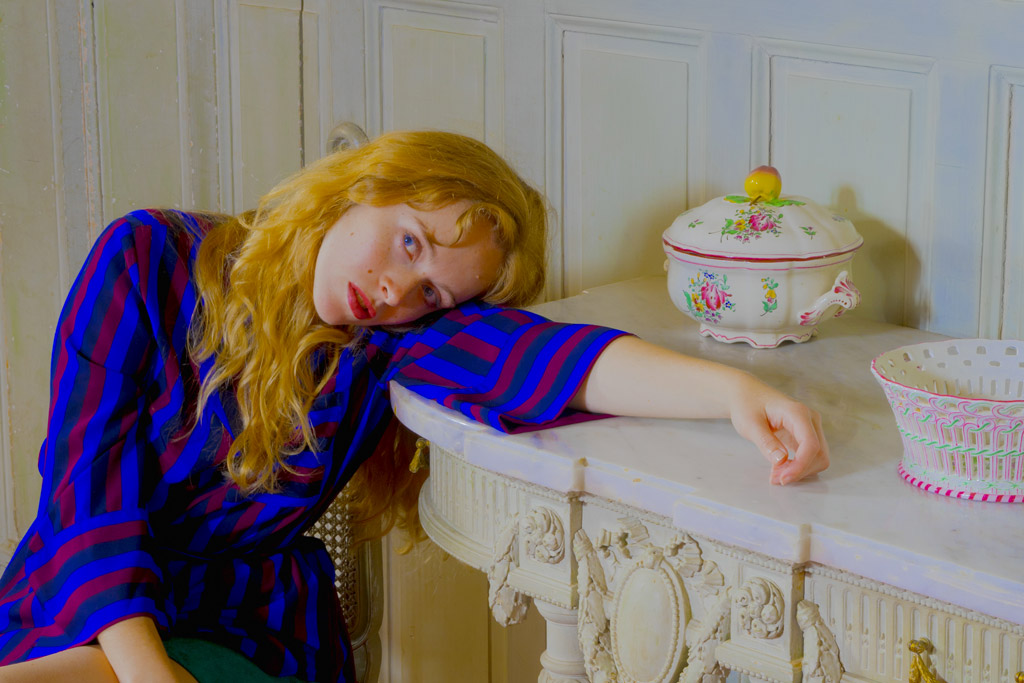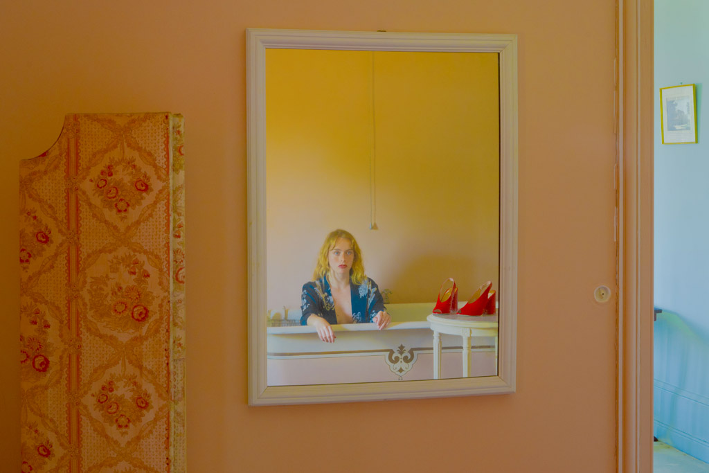Pour contrebalancer avec cette pratique impulsive et automatique, je fais aussi de la photographie de mise en scène. J’aime photographier des femmes avec des postures figées, comme coupées du temps. Je porte une grande importance aux vêtements et aux couleurs. J’aime les couleurs vives ; elles donnent un caractère régressif à la scène et, à la vue de l’image, remettent à jour un plaisir enfantin.