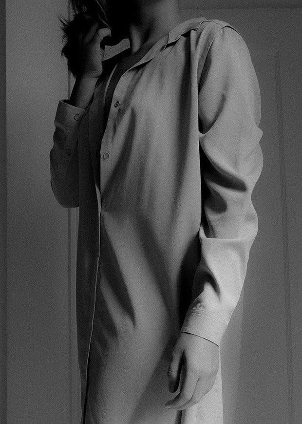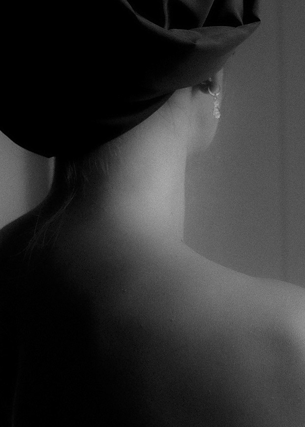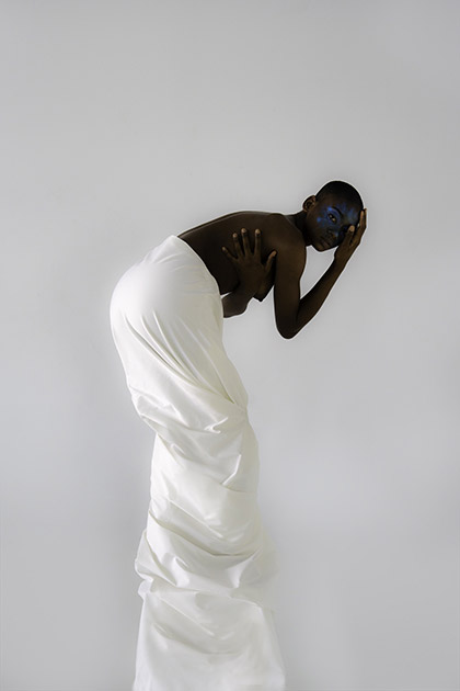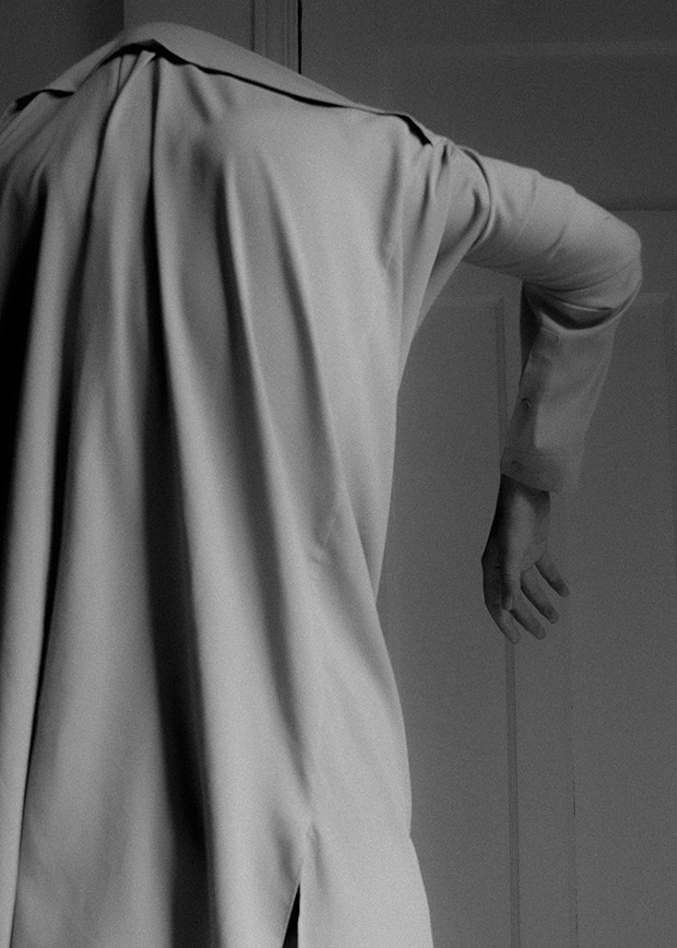 L’usage du noir et blanc résume la grisalle de l’esprit lorsqu’on est seul et sans activité. Je me suis mise en scène pour tenter d’illustrer les différents états d’esprit qui m’habitaient. Nous pouvons observer d’abord des portraits, qui me présentent en tant que personne, dans la plus grande intimité de mon logement. Ensuite, les photos illustrent l’attente et même parfois la folie, qui m’a gagné de temps en temps. J’ai tenté de m’habiller, pour garder le rythme de la vraie vie. Je me suis dénudé, souvent. J’ai aussi utilisé mes drapés, très récurrents dans mon travail.