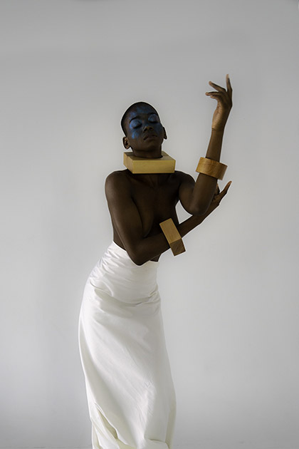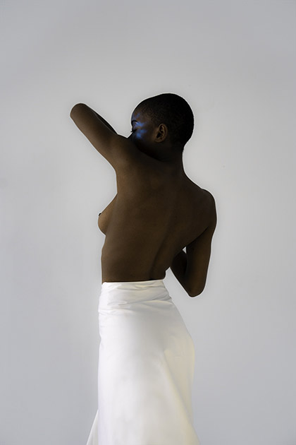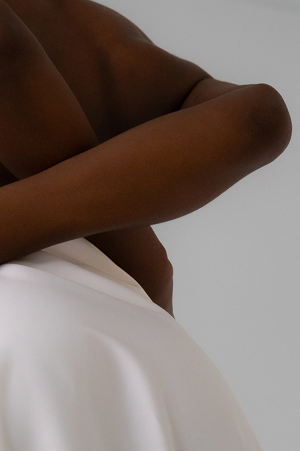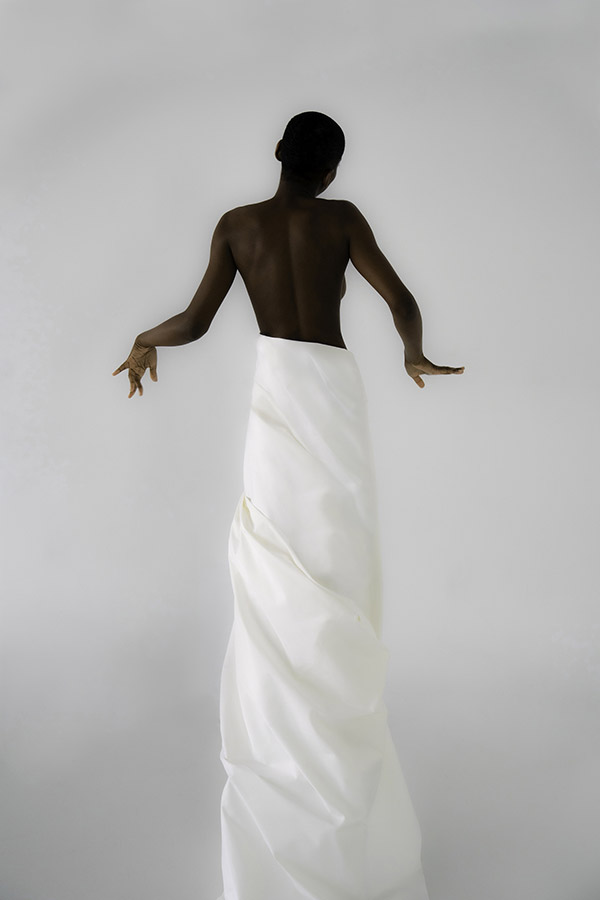 S’émanciper raconte l’histoire d’une femme qui se sent étouffée par certains aspects de sa vie. Plusieurs éléments l’empêchent d’avancer. J’utilise le drap/ socle comme métaphore pour illustrer ces derniers. Peu à peu, elle s’éman- cipe, se développe et grandit. Je mélange l’humain et la sculpture en utilisant un grand drapé blanc, ainsi que les bijoux d’une designer montréalaise. Ceux- ci sont géométriques et viennent former un contraste avec l’aspect organique et ondulé du corps. Entre légèrté et pesanteur, les photos nous dévoilent les différentes étapes d’un processus d’épanouissement personnel.